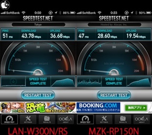 結果は「下り 43.78Mbps:上り 36.68Mbps」でした。ちなみに、MZK-RP150Nの場合は「下り 28.60Mbps:上り 19.54Mbps」でした。
