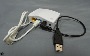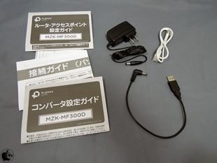 付属品は、ACアダプタ、USB給電ケーブル、短めのLANケーブル、印刷物一式です。