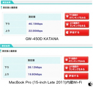 MacBook Pro (15-inch Late 2011)内蔵Wi-Fiは、3ストリーム802.11n(450Mbps)で、GW-450D KATANAの1ストリーム802.11ac(433Mbps)よりも理論値性能は高いのですが、実測性能はGW-450D KATANAの方が高いという結果でした。
