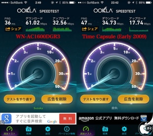 結果は、Time Capsule (Early 2009)の場合「下り34.73Mbps/上り17.74Mbps」、WN-AC1600DGR3の場合「下り61.02Mbps/上り32.56Mbps」という結果でした。