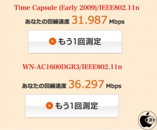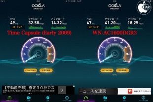 結果は、Time Capsule (Early 2009)の場合「下り32.58Mbps/上り14.32Mbps」、WN-AC1600DGR3の場合「下り41.20Mbps/上り18.25Mbps」という結果でした。