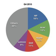Canalysが、コンピューターとしての体験を得られるとして、新しく、7インチ以上の高性能ノートパッドを含める方針に変更し、それによって、iPadも合算されたことにより、2010年第4四半期は、Appleが、Dellを抜いて、11.5%で世界第3位のPCメーカーとなったと報告しています。
