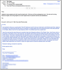 イギリスのウエディングフォトグラファーのTony Hart氏は、Tim Cook CEOに、Dixons RetailのCEOだったJohn Browett氏がApple Retail Store担当シニアバイスプレジデントになることについて、イギリスでDixons Retailは評判が悪い小売業者で、その元CEOが就任することによって、Apple Retail StoreがDixons Retail化し、Appleブランドが落ちることはないのか?とメールしたところ、Tim Cook CEOから、多くの人達と話しをした中で断然最高だったと褒め、彼の役目は、顧客サービスと満足度をより高いレベルに持っていく事であり、Dixons Retailを持ち込むことではないと返信があったと報告しています。