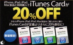 ヤマダ電機が、Apple ショップなど、Apple製品取り扱い店舗で、iPhone/iPad/iPod/Mac製品同時購入で、iTunesカードを20%オフで購入出来るキャンペーンを開催しています。