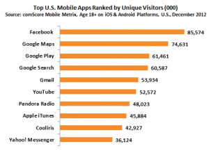 comScoreが、モバイル・トレンドおよび消費者の行動様式のインサイトを得る「Mobile Metrix」による、2012年3月〜2012年12月までの期間で、18歳以上のiOSプラットフォームとAndroidプラットフォームにおける、モバイルアプリのユニークビジター調査が行われ、その結果、2012年12月にアメリカでもっとも利用されていたモバイルアプリは「Facebook」アプリだったと発表しています。