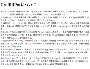また、閲覧できるカテゴリが制限されているが、ポルノ画像や誹謗中傷が多い 2ch.net を閲覧するブラウザである以上、カテゴリを制限したからといって許可できるものではないと説明を受け、GraffitiPot 以外に、6種類の 2ch閲覧アプリが App Store に存在することを把握しており、それら全てに関して、GraffitiPot と同様の問題があると考えており、今後、同様の措置を取っていく予定であると説明を受けたそうです。