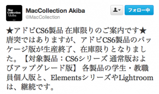Apple Premium ResellerのMacCollection Akibaが、Twitterで、アドビシステムズのAdobe Creative Suite 6パッケージ版が生産終了し、在庫限りとなったとツイートしています。