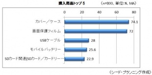 カバー/ケースが74.1%、画面保護フィルムが72%と最も多く、かなり下がって、USBケーブル、モバイルバッテリー、SDカード関連となっています。