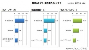 アイテム別による購入先調査の結果、約半数は家電量販店で購入しており、続くAmazonは約2割りで、楽天市場とキャリアショップが続く形となっています。