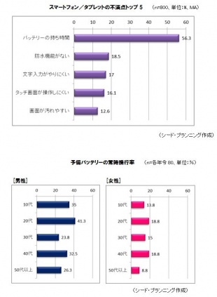 スマートフォン/タブレットの不満点のトップは、バッテリーの持ち時間で、バッテリーを購入したユーザー28%のうち、男性の方が常時携行率が高いという結果となっています。