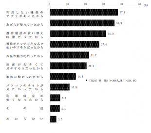 また「第4節 スマートフォンの利用状況」によると、現在利用している携帯電話がスマートフォンである青少年(368人)に、スマートフォン を持ちはじめた理由を聞いたところ、「利用したい機能やアプリがあったから」が 37.8%と最も多く、次いで「友だちが使っていたから」が 35.9%、「携帯電話の買い替え時期だった から」が 31.3%、「操作がタッチパネル式で使いやすそうだったから」が 27.4%、「外見が 魅力的だったから」が 21.7%、「画面が大きくて見やすそうだったから」が 20.4%と回答しているそうです。