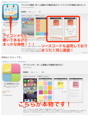 iPhone/iPadアプリ「アイコンメモ」の作者、Makoto Setoh氏が、Gorokuma Diaryで、my first book the natureなるデベロッパーが「アイコン付箋紙」というアプリをApp Storeで販売し、それがアプリだけでなく、アプリ内で使用している、サーバーに置かれているHTML, CSS, JavaScriptをコピーしてそのまま使用していると報告しています。