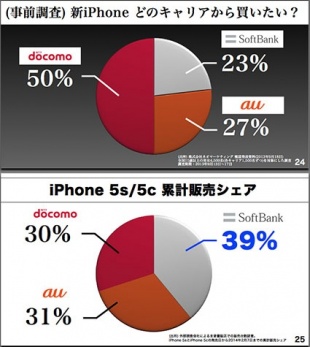 ソフトバンクが、2014年3月期 第3四半期決算発表を行い、iPhone 5s、iPhone 5c発売前の事前調査で、NTTドコモから購入すると回答した方が50%を超えていたが、実際販売された後の調査結果では、ソフトバンクモバイルが39%のシェアを獲得し孫社長は「危機は脱した」と述べました。