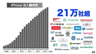また、孫社長は、法人ビジネスについても説明し、iPhoneの法人顧客数は21万社を超えていると説明し、国内市場において1位だと述べていました。