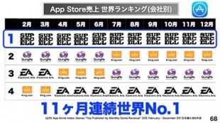 App Storeにおける売り上げに関しても触れ、国内2,400万ダウンロード、海外300万ダウンロードを超えている「パズル&ドラゴンズ」を提供しているガンホー・オンライン・エンターテイメントに加え、世界的人気アプリ「Clash of Clans」を配信しているSupercell(2013/10買収)により、急激な営業利益を上げていると説明しました。