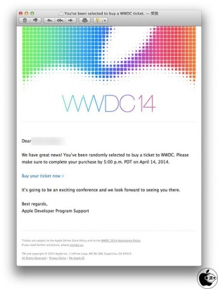 Appleが、2014年6月2日〜6日にサンフランシスコのMoscone Westにおいて開催する「WWDC2014」のチケット購入申込を終了し、チケット購入当選者にメールで通知を開始しています。