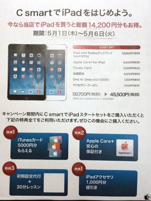 Apple製品取扱店の、Apple Premium Resellerや、量販店店舗内にあるApple Shopなどにおいて、iPad AirまたはiPad mini RetinaのWi-Fiモデルと、AppleCare+を同時購入すると、iTunesカード 5,000円分に加え、初期設定サポートや、アクセサリ割引券などが貰える「ちょっといい ニュースです」キャンペーンが実施されています。