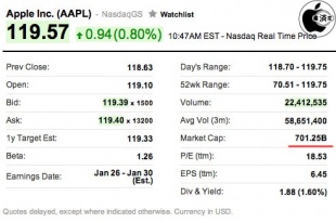 2014年11月26日(水) NEWS#Apple#時価総額 Apple、時価総額が初の7000億ドルを突破 ※本サイトは、アフィリエイト広告および広告による収益を得て運営しています。購入により売上の一部が本サイトに還元されることがあります。 Appleの株価が、10:47分時点で119.57ドルをつけ、Appleの時価総額が初めて7000億ドルの大台を突破しています。 2014年第3四半期の米国内総生産(GDP)改定値が前期比年率3.9%増と上方修正されたことが相場全体の追い風となり、テクノロジー株が買われているようです。