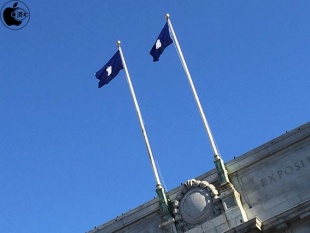 会場の上には、Appleロゴマークの旗が使われていました。
