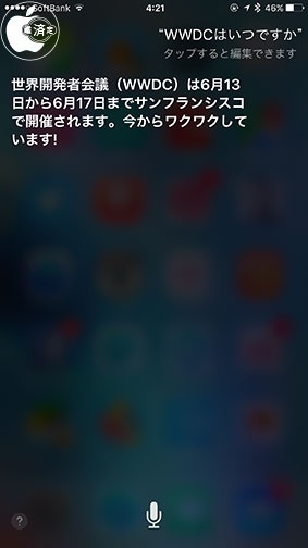 Siri、WWDC2016は2016年6月13日〜17日にかけてサンフランシスコで開催されると回答する