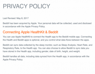 Appleが、睡眠トラッカーメーカーのBedditを買収したようで、同社のプライバシーポリシーに追記がされています。