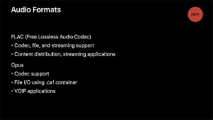 Appleが、WWDC2017のセッション「What's New in Audio」において、iOS 11、macOS High SierraのAudioUnitsで、FLAC、Opusフォーマットをサポートすると説明しています。