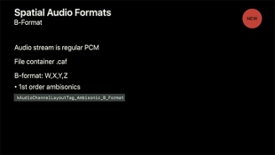 3Dオーディオもサポートされ、PCM、W・X・Y・Zと呼ぶパラメータで構成されたBフォーマット、Core Audio File(caf)で構成されています。