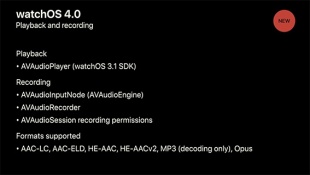 watchOS 4.0では、オーディオフォーマットとして、AAC-LC、AAC-ELD、HE-AAC、HE-AAC v2、Opus、MP3(復元のみ)がサポートされます。