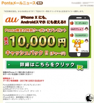 2017年12月09日(土) NEWS#Ponta#KDDI#iPhone Ponta会員限定で、auのiPhone購入時に、au WALLET最大1万キャッシュバックが貰えるクーポン発行中 ※本サイトは、アフィリエイト広告および広告による収益を得て運営しています。購入により売上の一部が本サイトに還元されることがあります。 共通ポイントPontaが、Ponta会員限定で、auのiPhone購入時に、au WALLET最大1万キャッシュバックが貰える「auクーポン」(Ponta Webにログイン必要)キャンペーンを実施しています。 新規加入またはMNPで最大10,000円、機種変更で最大5,000円キャッシュバックされます。 キャッシュバックはiPhoneの機種と容量によって異なります。 クーポンの有効期限は2017年12月31日までとなっています。
