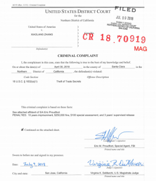 Zhang氏は、2018年7月7日に中国に逃亡しようとしたため逮捕されたようで、本人は情報窃盗の罪を認めており、最高10年の懲役と25万ドルの罰金を科せられる可能性があるそうです。