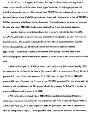 2018年4月にZhang氏は、子供が生まれたことを理由に休暇を取得し、その間にXMotors.aiへの転職を決め、上司に転職する意向を告げたところ、その態度に不振を抱き、同社のデジタルフォレンジックス調査チームが調べたところ、Appleの自動運転のソフトウェアとハードウェアの研究所からデーターや部品などを盗んでいたことが判明したそうです。