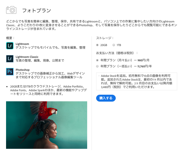 日本では、980円/月のLightroomプランに加え、Creative Cloudフォトプランとして、クラウドストレージ容量が20GBのプラン(980円/月)と1TBのプラン(1,980円/月)の2種類が提供されています。