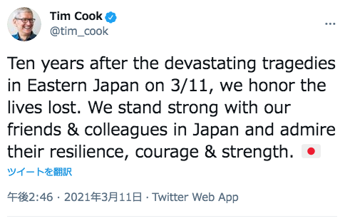 Tim Cook CEOが、東日本大震災の発生から10年に当たって、コメントをツイートしています。