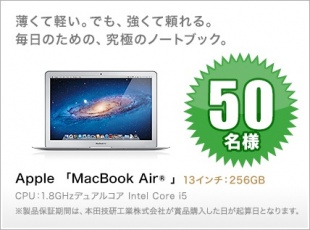 1名に好きなホンダ社が1名に当たり、さらにMacBook Pro (13-inch)が50名、NEX-3NY ダブルズームレンズキットが50名など、商品総額2,000万円以上のプレゼントキャンペーンです。