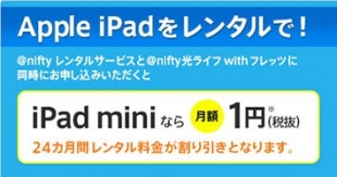 ニフティが、@nifty レンタルサービスと@nifty光ライフ with フレッツを申込した方を対象に、iPadのWi-Fiモデルを月額1円(税抜)〜でレンタル出来る「ネット回線と合わせて、iPadがお得にレンタルできるキャンペーン」を実施しています。