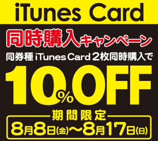 ビックカメラ、ソフマップ、コジマ、iTunes Card 2枚同時購入で10%オフキャンペーン開催中(8/17まで)
