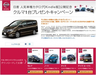 2014年12月12日(金) プロモーション#日産自動車#Amazon 日産自動車、Amazonで、自動車カタログ[Kindle版]をダウンロードした方の中から抽選で「車1台」が当たるプレゼントキャンペーンを実施中 ※本サイトは、アフィリエイト広告および広告による収益を得て運営しています。購入により売上の一部が本サイトに還元されることがあります。 日産自動車が、Amazonで、自動車のカタログ[Kindle版](無料)をダウンロードした方の中から抽選で「セレナ」「ノート」「デイズ」「デイズ ルークス」の車種の中から好きな車が1名に当たる「今人気の4車種から選んで1台プレゼント!」キャンペーンを実施しています。 応募締切は、2015年1月19日(月)17:00までとなっています。