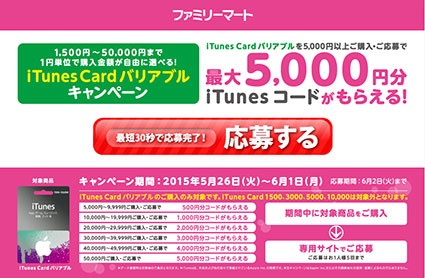 ファミリーマート、iTunes Cardバリアブル 5,000円以上購入でデジタルコードをプレゼントする「iTunes Card キャンペーン」を開始