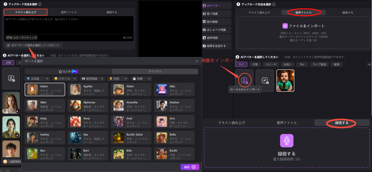 動画素材を用意している場合は、音声同期機能を使い、テキストを入力するだけで、唇の動きに合わせてキャラクターが口を動かし、より自然な動画が完成します。