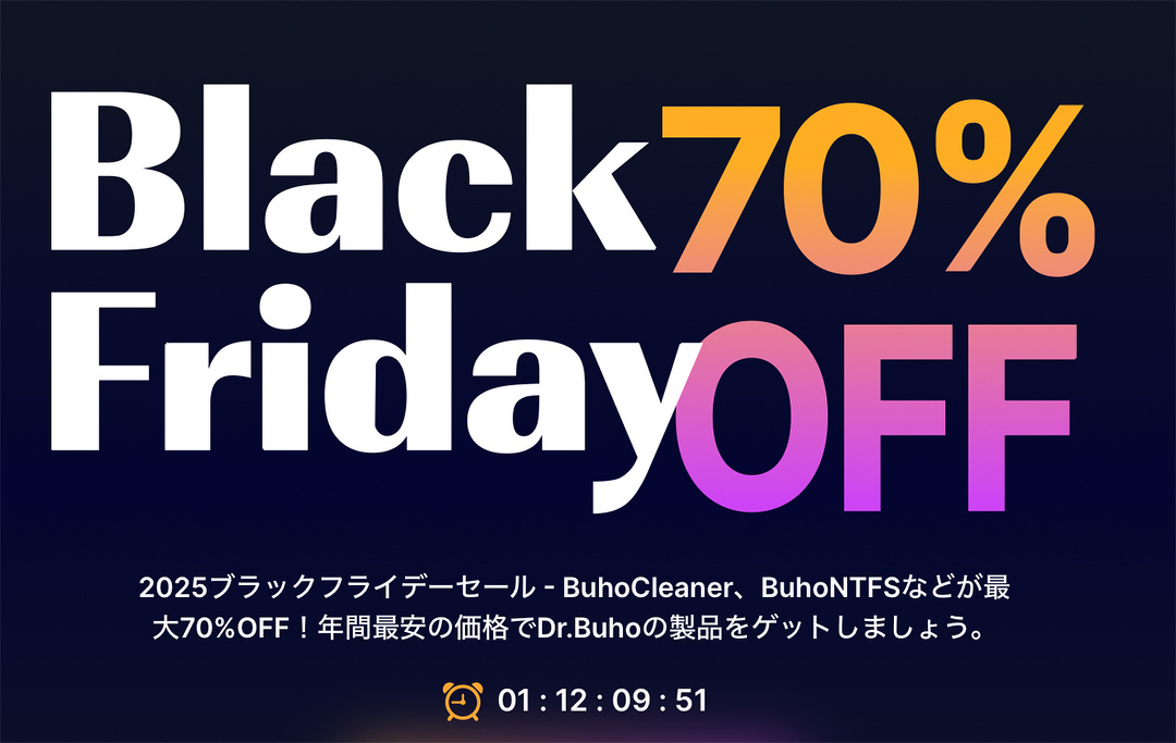 Dr.Buhoが、Mac用クリーンアップソフトウェア「BuhoCleaner」や、iPhoneユーティリティアプリ「BuhoUnlocker」「BuhoRepair」を最大70%オフで販売する「Dr.Buho:ブラックフライデーセール2025年」を開催しています。