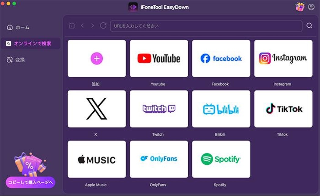 YouTube/TVer/Twitch/Twitter/Tiktok/ニコニコの動画保存以外、Spotify/Apple Music/YouTube Music/SoundCloudの音源ダウンロードまでサポートします。総計1000以上の動画、音楽、SNSサービスに対応する汎用性が高いソフトとなります。macOS Catalina 10.15以降の環境で動作可能です。