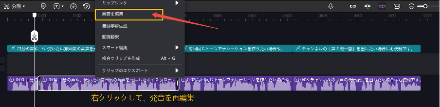 AI音声を生成すると、字幕(テキスト)が自動で文ごとに分割されて表示されます。