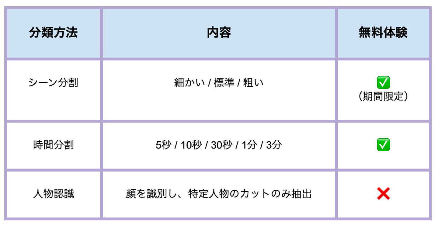 シーン分割の細かさや、一定時間ごとのカットにも対応しており、素材整理の手間を大きく減らせます。