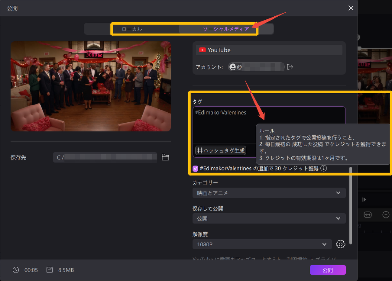制作した動画を「エクスポート」→「ソーシャルメディア」からYouTubeなどへ投稿し、指定タグを設定することで、最大1日30 AIクレジットを獲得できます。