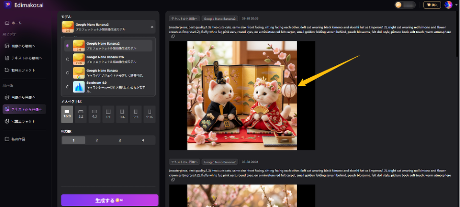 さらにWeb版では最新モデルNano Banana2を追加!生成スピードも速く、画質や仕上がりもより美しく、コストパフォーマンスも抜群です。今年のひな祭りは、Edimakorで手軽にオリジナルのかわいい写真を楽しみましょう✨