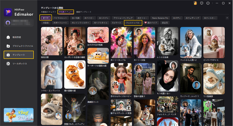 1.まずEdimakorを起動し、メイン画面から「テンプレート」を選択します。表示される一覧の中から「AI写真エフェクト」をクリック。