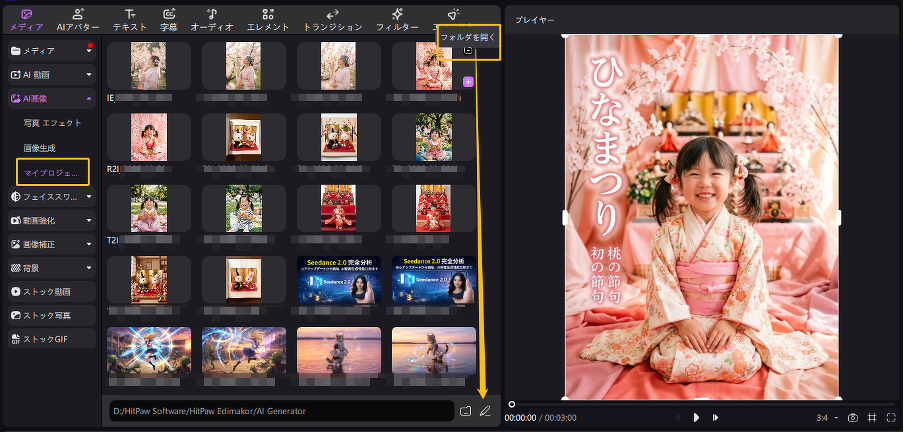 3.生成完了後は「マイプロジェクト」からプレビューします。仕上がりを確認後、透かしなしでひな祭りイラストが保存できます。