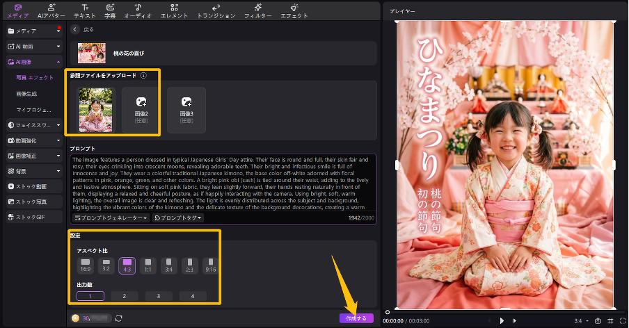 2.「フェスティバル」カテゴリからひな祭りテンプレートを選び、写真をアップロードして生成設定を調整。