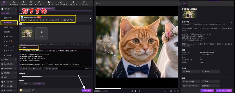 生成後は、動画画質補正機能を使って4K画質にアップスケールすることも可能です。