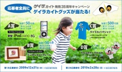 エー・ジーが、ゲイラカイト 発売35周年を記念して、対象商品のパッケージについているバーコードを郵便ハガキに貼って応募すると、抽選で50名にゲイラカイトのロゴ刻印入りiPod nano (5th generation)が当たる「ゲイラカイト発売35周年記念キャンペーン」を開催しています。